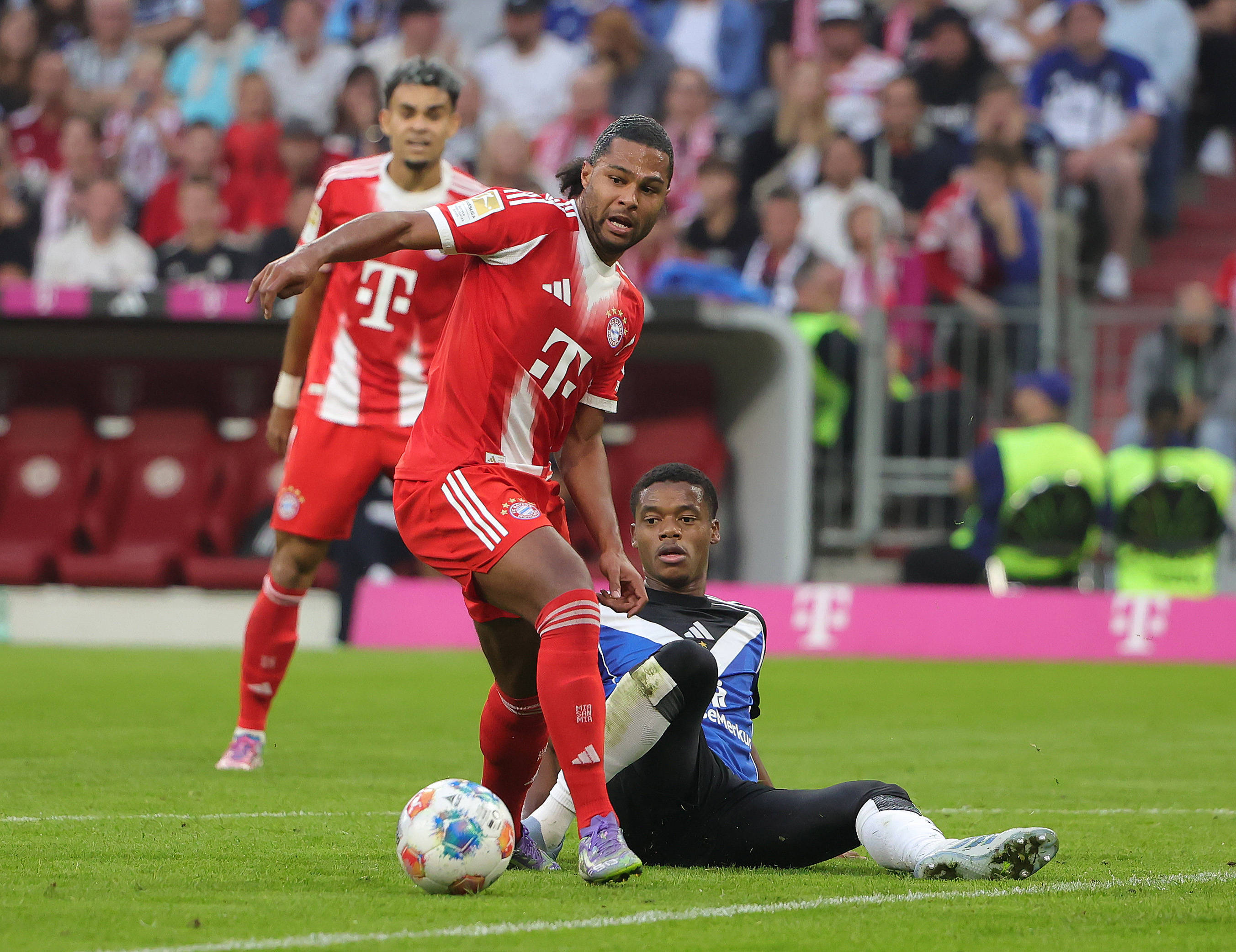 9月13日,拜仁慕尼黑队球员迪亚斯(右)与汉堡队球员奥马里在比赛中拼抢。 新华社发(菲利普·鲁伊兹摄)